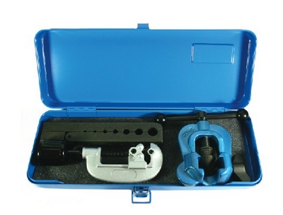 用于铜管、铝管、黄铜及软质钢管的扩口。 压铸锌机体,钳口为钢质。 开口角度90°与管子成45°。 配有管道切割器,铁盒装。