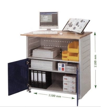 尺寸: 宽 1100×深 800×高 1100 mm。 实心操作面 宽 1100×深 800×高 25 mm 带漆表面, 圆形边角。 稳定和扭转自由钢板结构。 开放式货架, 高 370 mm ,柜体后部可接电源线及有线电视线。 底柜为双叶门(可上锁) 分为两个储物空间 (170 和 330 mm)。 可选固定式(通过底座可水平调整) 或者移动式(有2个固定脚轮和2个旋转脚轮)。 柜体: RAL 7035 浅灰, 门: RAL 5010龙胆蓝。 柜体:RAL 7016 煤灰色, 前面板 RAL 5012 浅