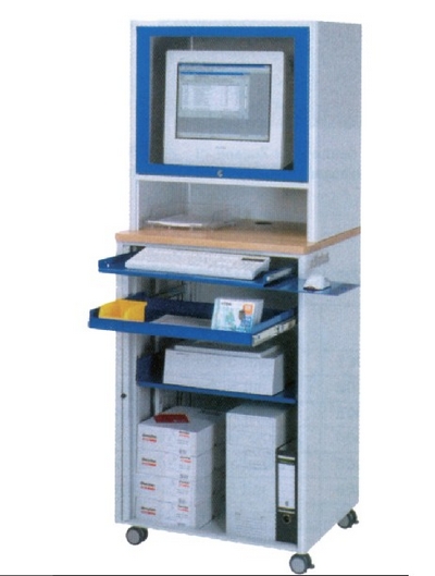尺寸: 宽 720×深 660×高 1850 mm。 显示器柜体 (宽 720×深 550×高 750 mm) 有带锁的滑动门及大视窗。 可以用于最大 21”的显示器. 含风扇及过滤垫, 显示器柜下有个大尺寸开放式货架 (高 180 mm), 一个卷闸柜,可锁。 可选固定式(可水平调整)或者移动式(带固定脚轮)。