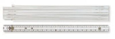 Beech wood folding rule, section thickness 3,0 mm, height 16 mm, no. of sections 10, fatigue-free internal joint springs. The internal joints allow a continuos straight edge when unfolded. White varnish, 2 m length with Duplex-graduation. Packing unit: 50