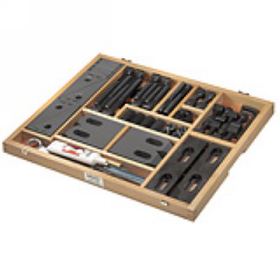with low height clamping jaws no. 6490 and thread paste no. 6339. These case assortments are for machine tools with T-slot tables and contain all neccessary elements for fast clamping of dies, fixtures or workpieces. All items are interchangeable and can