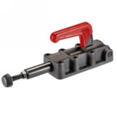 with solid lever. For push- and pull-clamping. (Equal operation of rod and lever). Heavy-duty version with long rod-guide. Base of malleable casting, burnished. Hardened pins. Lever-parts and rod of tempered steel, burnished. Handle made of red, oil-resi