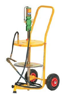 用于50kg油桶,配有: 气动黄油泵1:60 手推车,车轮为充气轮胎 桶盖?395mm 铠装软管3m,G2” 带管油枪